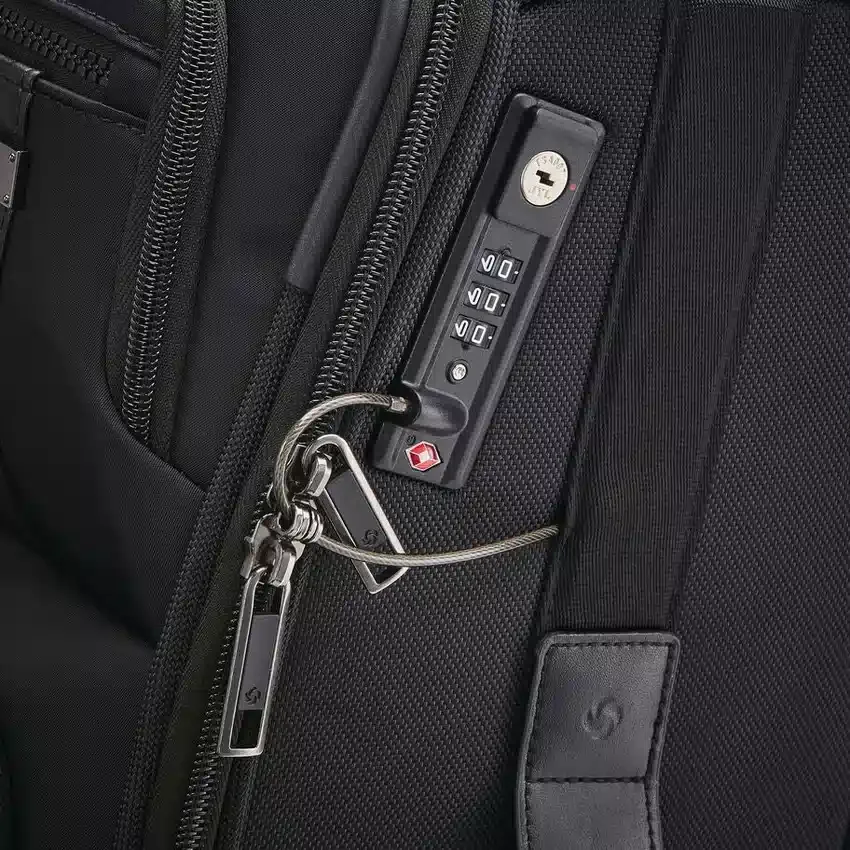- TSA-godkänt kabellås: TSA-godkänt kabellås dras genom dragkedjorna för att säkra åtkomsten till huvudfacket