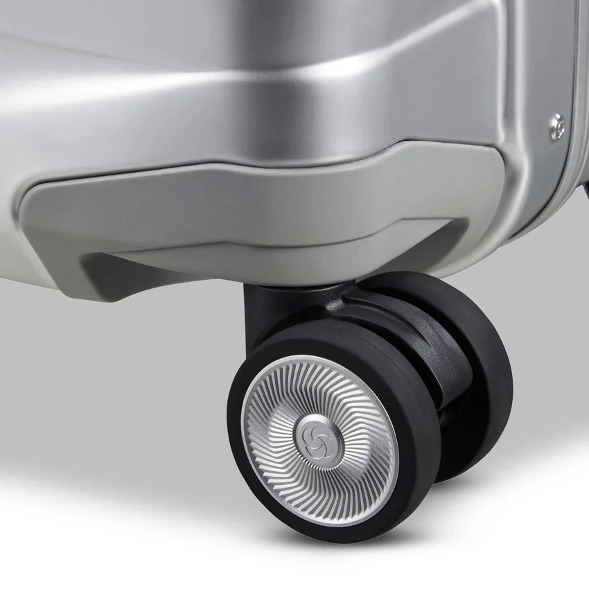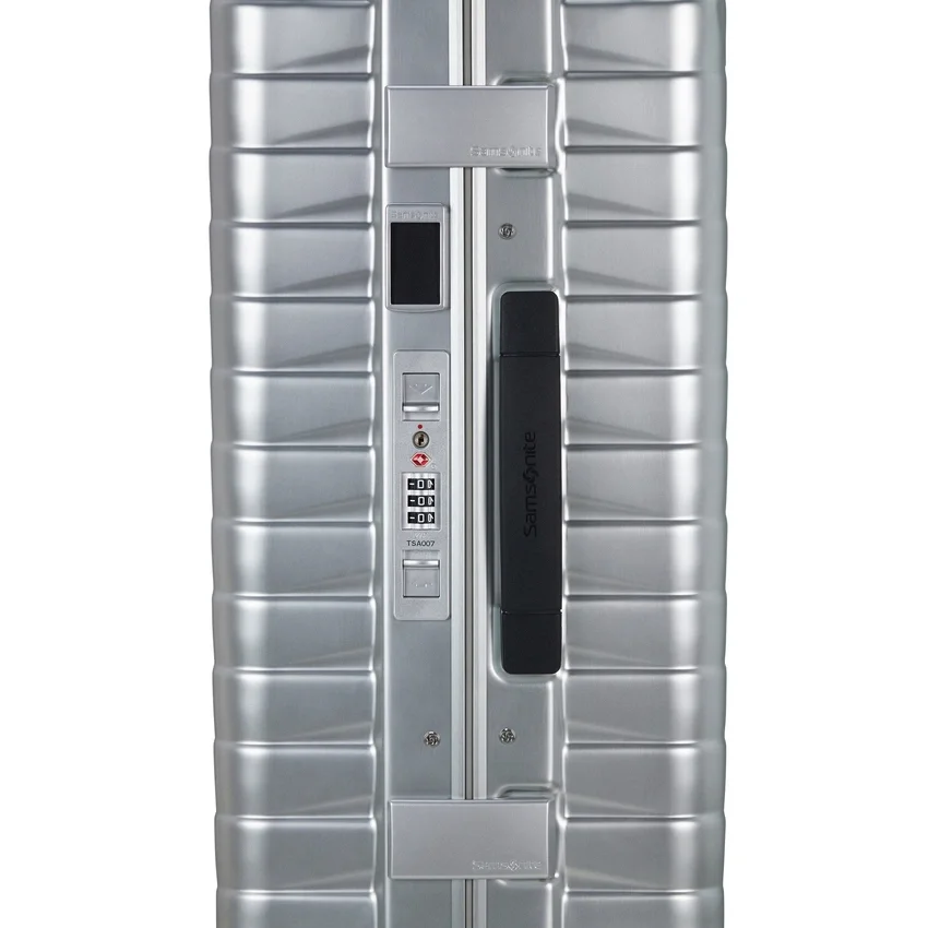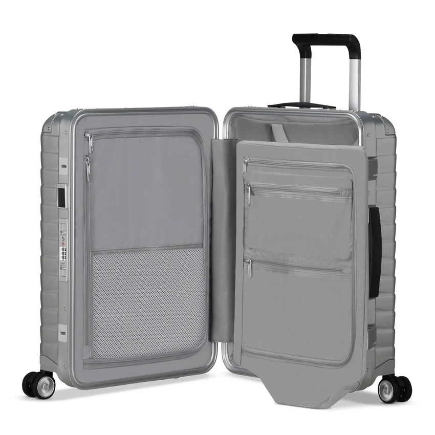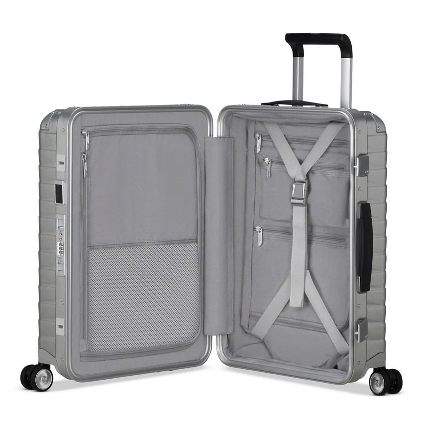 Vår robusta men samtidigt eleganta kabinväska i aluminium väger 5,37 kg och är fullt utrustad med de välbekanta funktioner du har kommit att uppskatta. Den har bland annat 360°-spinnerhjul för smidig rörlighet och TSA-godkända lås. Med tiden får aluminiumväskor ofta repor och bucklor, vilket ger dem mer karaktär för varje resa.Yttre egenskaper: