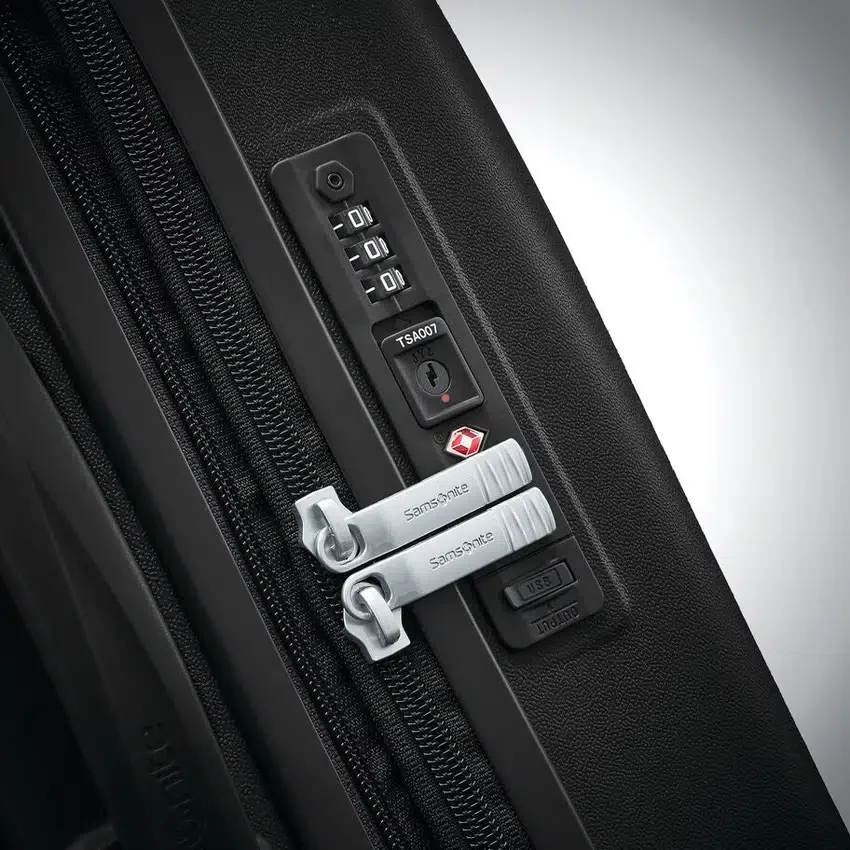 USB-port med skyddskåpa integrerad i den TSA-godkända låspanelen för strömlinjeformad design och bekväm laddning (batteri ingår ej)