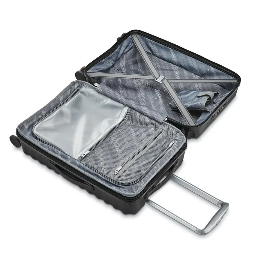 förväxla aldrig väskor vid resväskobandet igen. Dina Voltage-väskor sticker ut med sitt konstfullt formade skal av polypropen, som också tål hårdhänt bagagehantering. Den tredimensionella utsidan öppnar upp mot ett rymligt inre som kan utökas ytterligare för extra packningskapacitet. Och integrerade fickor håller dina tillhörigheter snyggt organiserade. En dynamisk design för en dynamisk reseupplevelse.Yttre egenskaper: