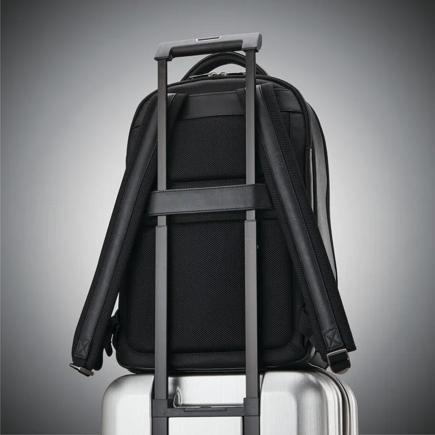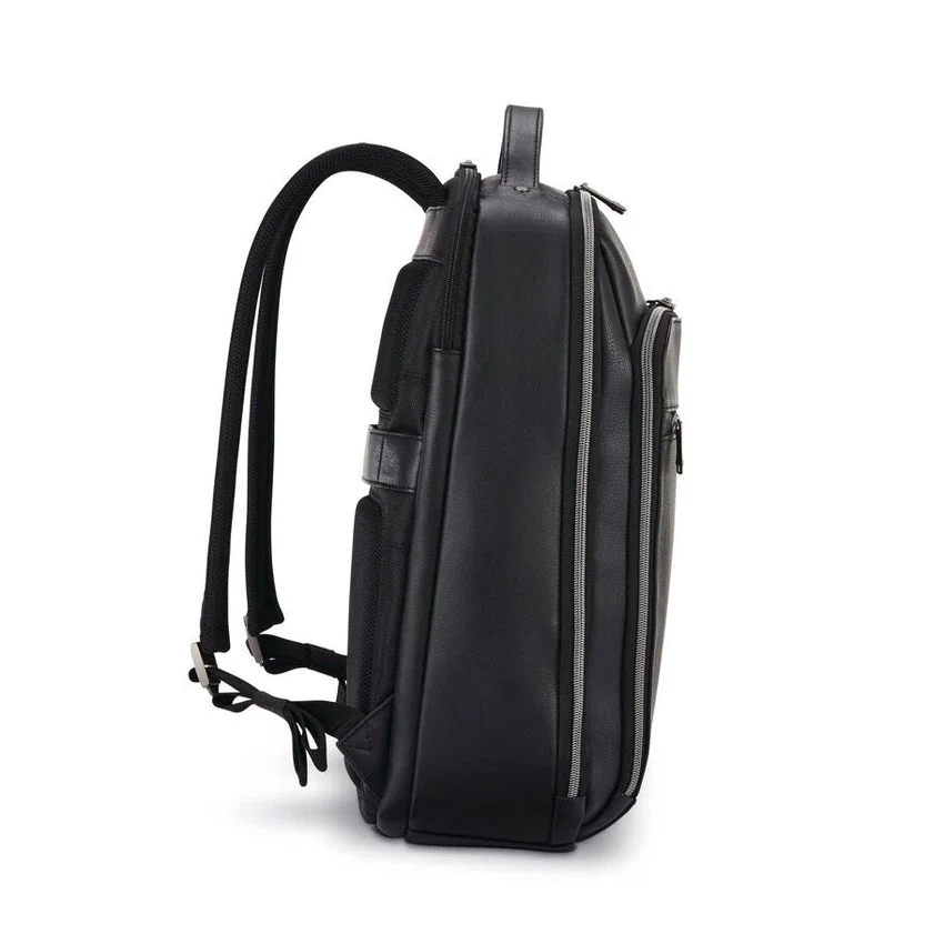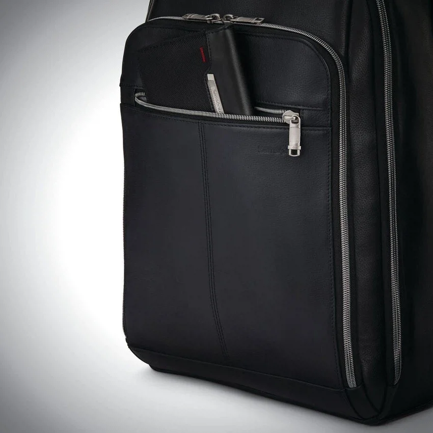 Bär med stil med en Samsonite-ryggsäck i skinn för bärbara datorer – utformad för komfort, skydd och utrymme för två bärbara datorer, dokument och vardagliga nödvändigheter.