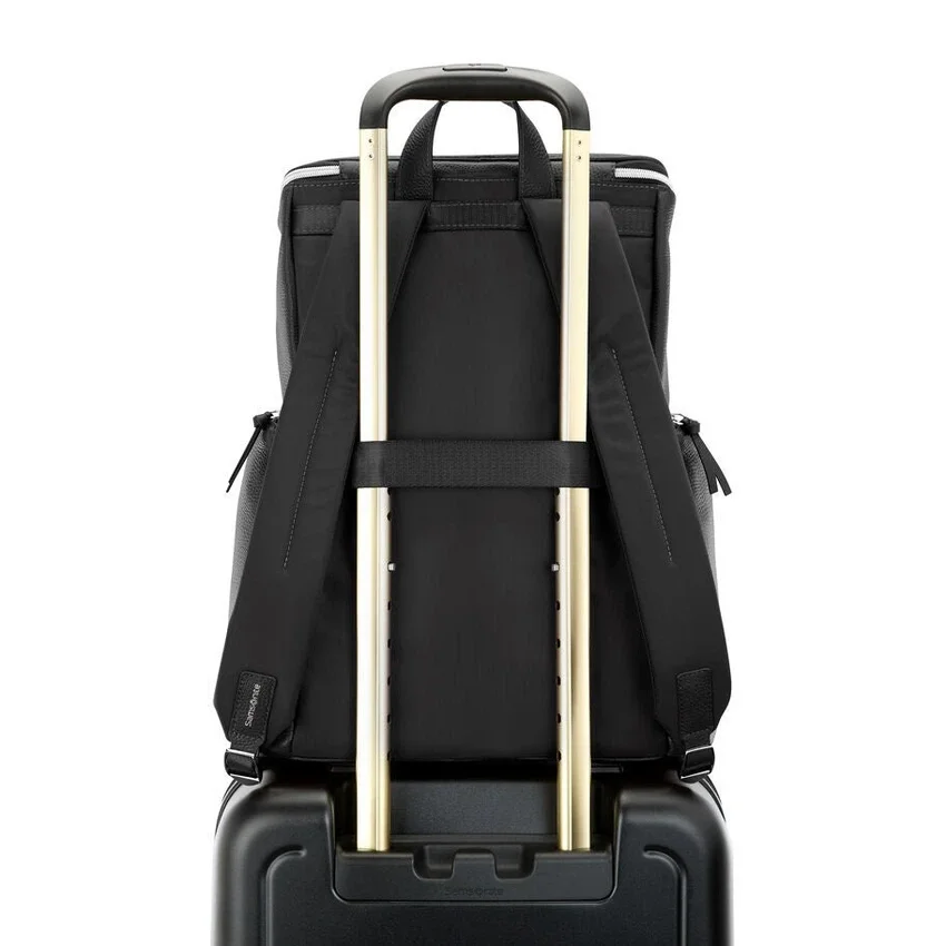 denna lyxiga skinnryggsäck har vadderade fack för bärbar dator och surfplatta, en rymlig framficka, två sidofickor med dragkedja för vattenflaska eller paraply samt bekväma axelremmar. den inbyggda stackit™-remmen underlättar pendling och resor.